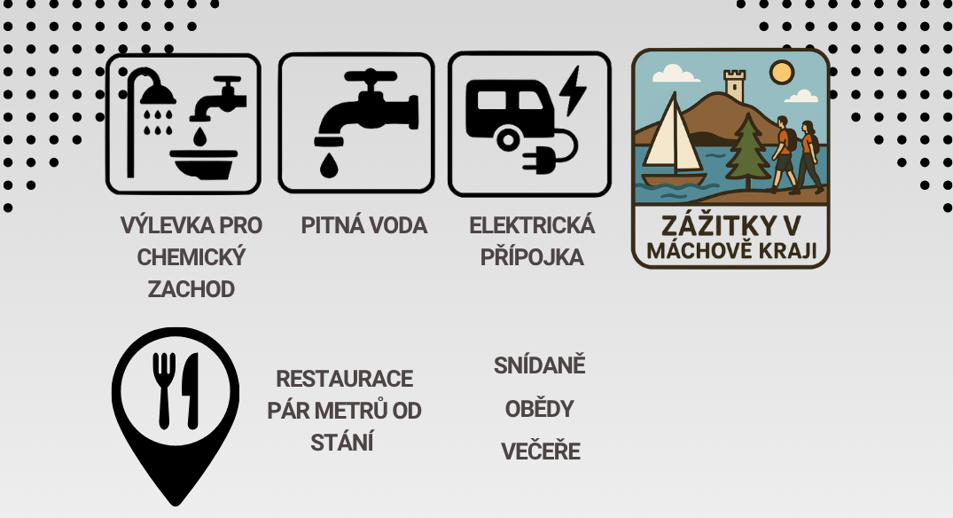 Pokud zrovna projíždíte kolem a potřebujete si udělat servis. Servisní místo Vám bude k dispozici s výlevkou na šedou vodu a napuštění pitné vody