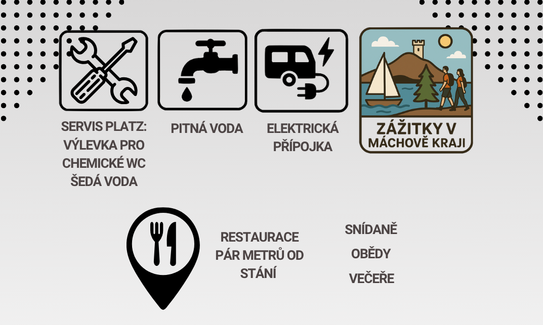 Servisní místo: V areálu je výlevka na šedou vodu, chemické WC a doplnění pitné vody.